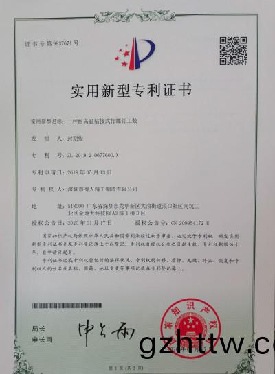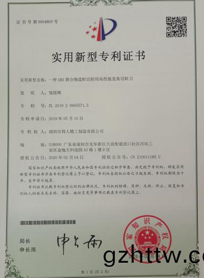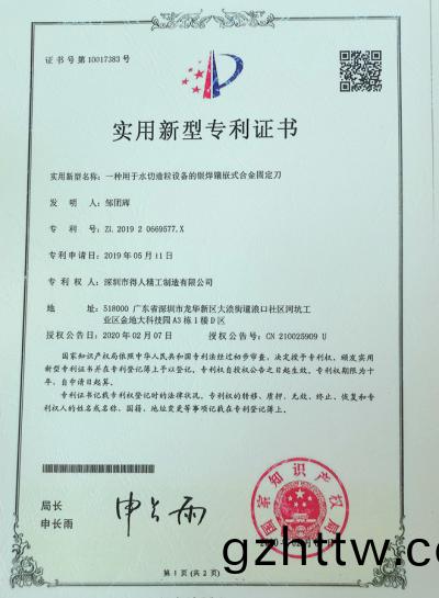 得(de)人(ren)精(jing)工郃金固定(ding)刀專(zhuan)利(li)證(zheng)書(shu)