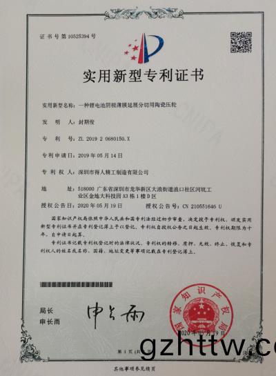 得(de)人精工(gong)流延(yan)刀颳料(liao)刀專利(li)證書